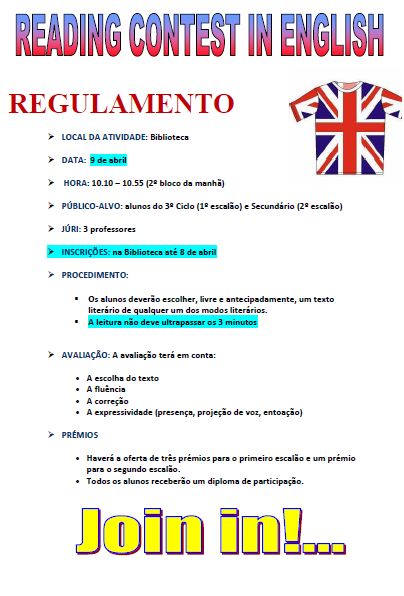 Realizaram-se, nos dias 8 e 9 de abril, os Concursos de Leitura Expressiva em Português, Inglês e Francês. Esta atividade, bastante apreciada pelos alunos, contou com uma média de 27 participantes em cada modalidade do concurso.